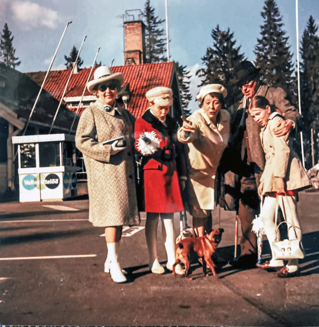 Vappuna 1971 Puijolla. Kuvassa Katriinan lisäksi siskon kummivanhemmat ja äiti. Vasemmalta Anna-Liisa Kamensky, Katriina, Irmeli Heinänen (äiti), Antti Kamensky, Tiia Honkanen sekä Sarma-koira.